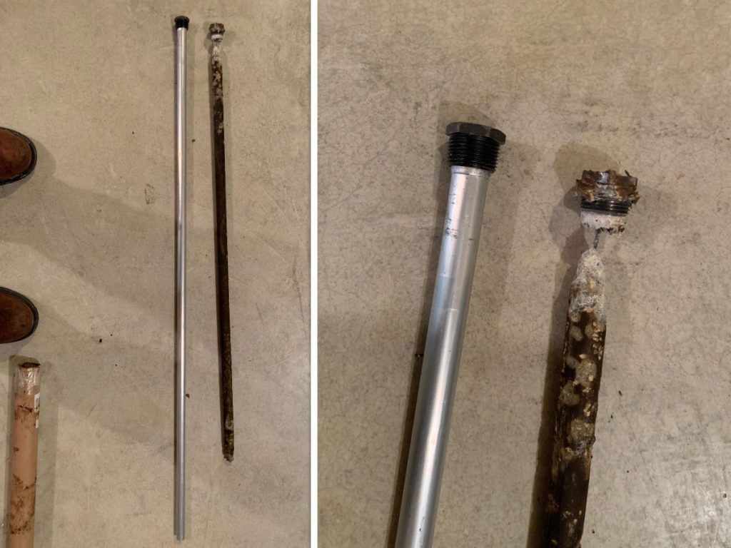 Alpha Plumbing replaced a corroded anode rod for a residential water heater in Pasadena. Check out the comparison between the old and new rods — you can see the old rod was just about to break! The anode rod is a sacrificial part that attracts corrosive elements so that the rod will rust and corrode instead of the tank. As this home was on a well, Alpha Plumbing provided a “smelly” anode rod to help prevent the bad odor that can be caused by chemical reactions with well water.