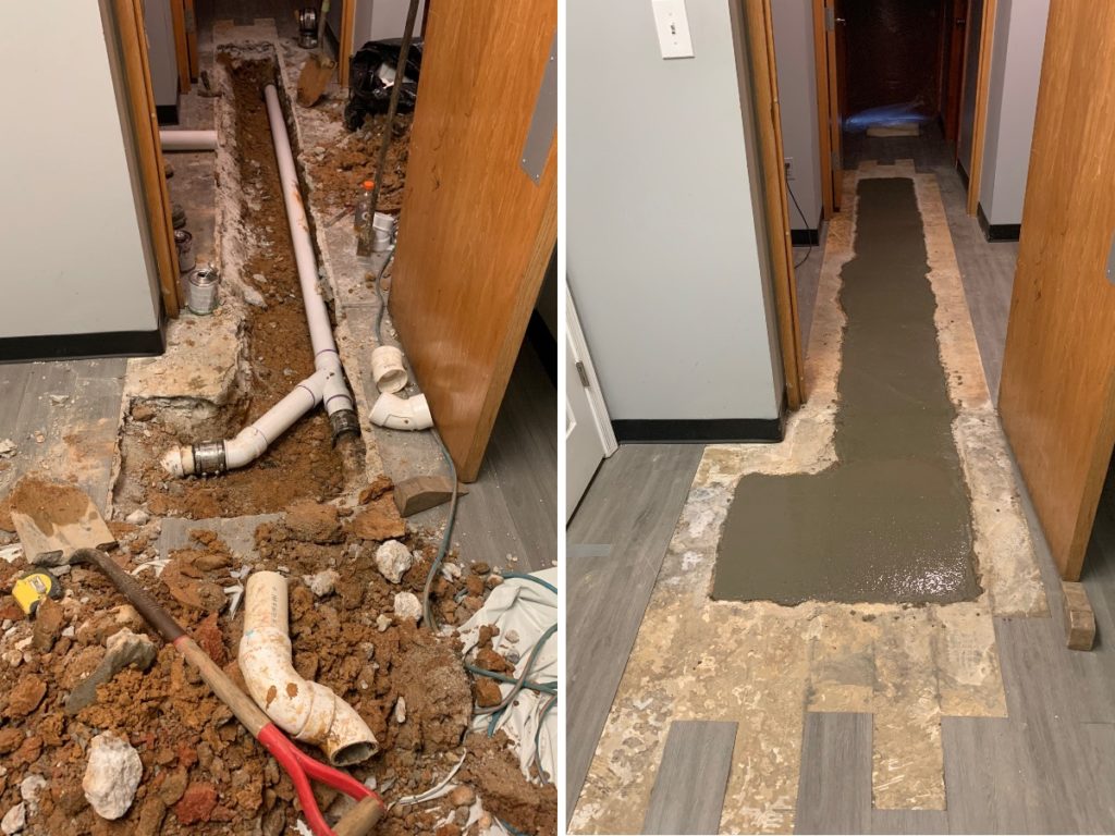 Alpha Plumbing replaced a cast iron drain for a commercial customer in Halethorpe. We jackhammered the floor to expose the pipe and then replaced the bad section with 4” schedule 40 PVC. When finished, Alpha Plumbing hauled away all debris and rough patched the concrete.