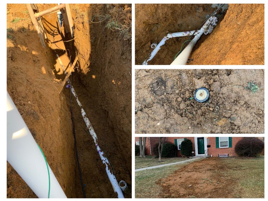 Alpha Plumbing replaced the main sewer line for a customer in Baltimore County. We also replaced multiple drains inside the home, including the laundry drain and the main stack serving several bathrooms. Here you can see the trench dug by our excavator with the new 4″ sewer inside. You can also see the tap connection, cleanouts, and finished job.