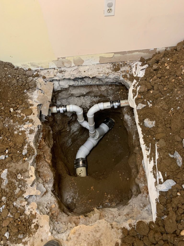 Alpha Plumbing repaired a broken drain for a commercial customer in Annapolis. After video inspecting to identify and locate the misaligned pipe, we used an electric jackhammer to open up the concrete floor. Alpha Plumbing then replaced the problematic 4″ x 2″ wye combo in the main that picked up two service sinks. Here you can see the finished repair before the backfill and concrete patching.