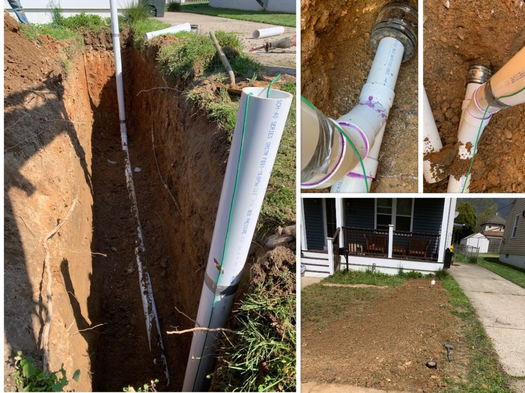 We’re at it again! This time Alpha Plumbing replaced a sewer service for a homeowner in Linthicum Heights. The new sewer is 4″ schedule 40 PVC pipe with cleanouts at each end. Here you can see the trench, tap connection and finished job.