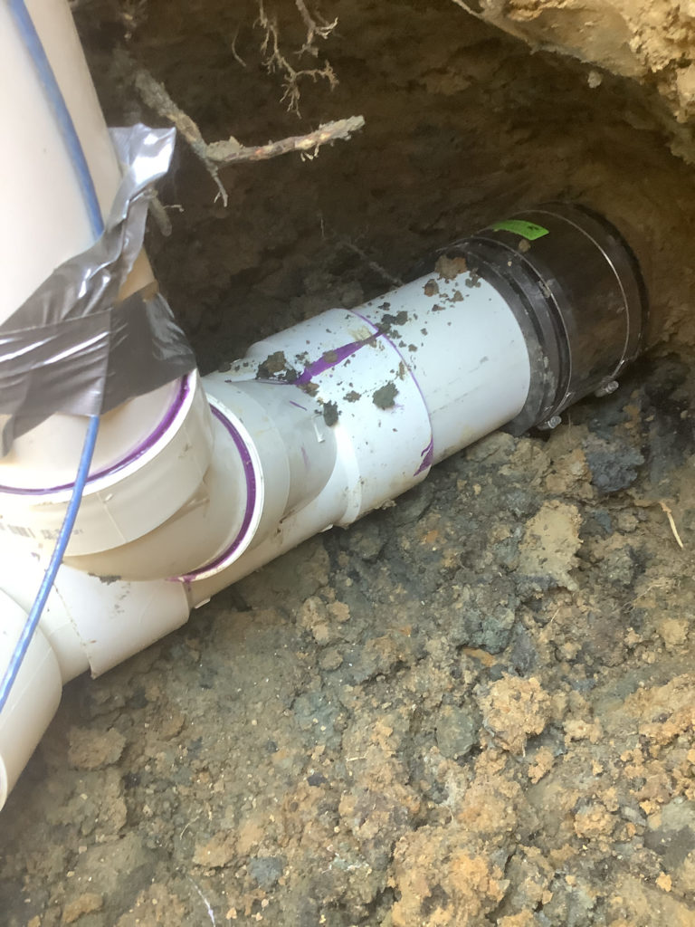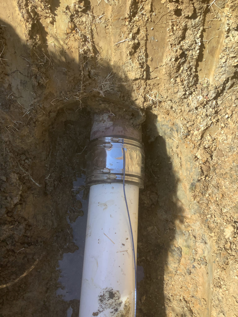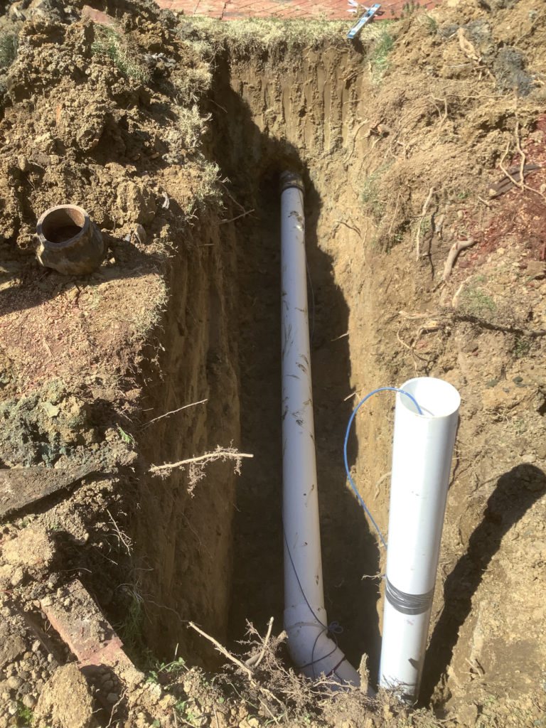 Alpha Plumbing replaced a sewer for a client in Baltimore. In the pictures you can see the connection to the cast iron exiting the home, the connection to the terracotta city tap connection with the cleanout extended to the surface and the trench. There is also a tracing wire running with the PVC pipe so that if necessary it can be located in the future. Following the installation of the sewer and the inspection by the city inspector, the trench was backfilled.