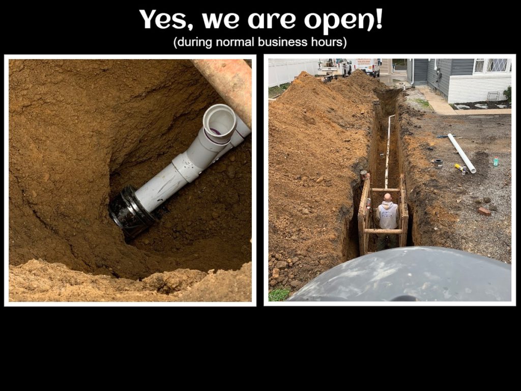 Plumbers are essential, which means we will be available during our usual business hours to assist with urgent plumbing needs. Here are pictures from Alpha Plumbing’s recent sewer service replacement in Anne Arundel County. In our first picture you can see the county tap connection, and in the second you can see the trench. We made the replacement with 4″ schedule 40 PVC pipe and installed cleanouts at both connection points. For the cleanout nearest the street, Alpha Plumbing installed a traffic-bearing lamppost cover.