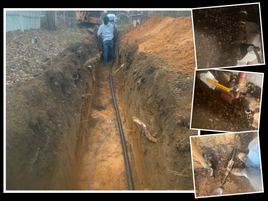 Alpha Plumbing replaced a water service for a homeowner in Essex. As the property was a flag lot, this water service was quite long — about 800 feet! In the photo on the left, you can see the trench with the new pipe and tracer wire. Also pictured are the PRV and dual check valve, the inside shutoff valve, and the connection just outside the home.