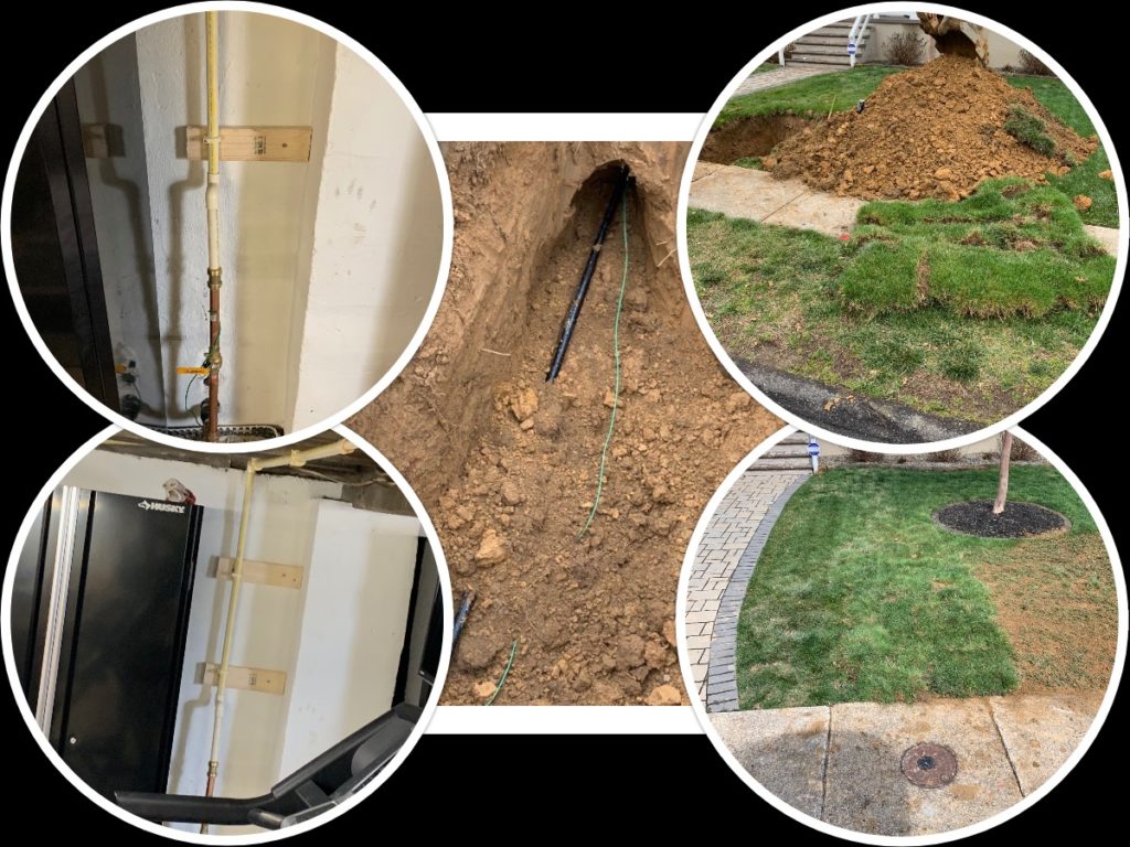 Alpha Plumbing replaced a water service for a homeowner in Linthicum today. The new line is 1” HDPE pipe, shown here in the center picture. We also installed a new main shut-off valve and ran 1” CPVC pipe to connect to the copper just before the PRV. Upon completion of the job, Alpha Plumbing backfilled the excavation and left the yard in great shape — we were even able to save the homeowner’s grass!